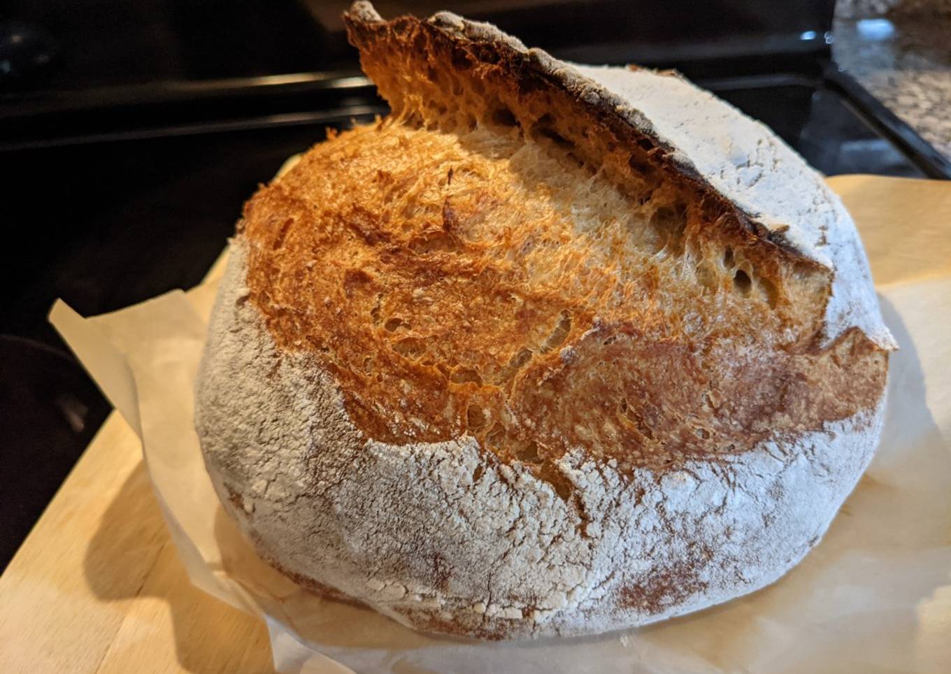 - Flip the dough onto parchment paper and score. Place into dutch oven and bake for 20 minutes with lid on, then remove the lid and bake for additional 20-30 minutes at 430F or until golden brown crust.