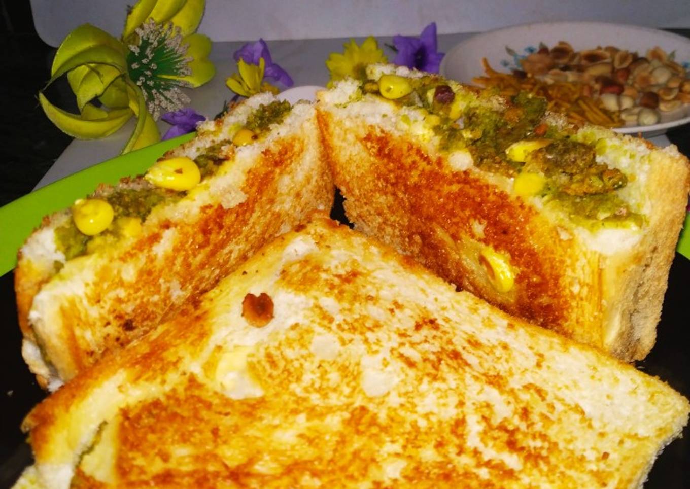 - Take a bread piece stuff the griended mixture mix with hand ful corn.Put a butter pepper over the stuff bread.Put the second bread top of the first bread.Shallow fry the bread with some butter.
