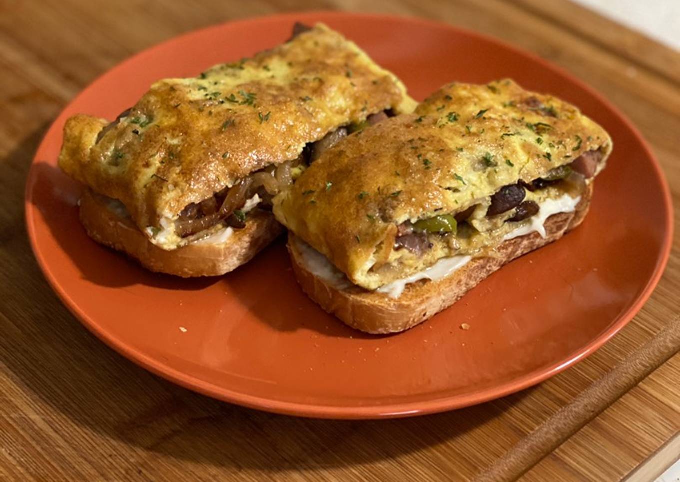 - Fold one third of the omelette towards the center. Then do the same on the opposite side. When two sides have been folded in on itself, hold it down momentarily with the spatula to allow it to seal together. Carefully flip the seam down. Turn off heat. Cut into sections suitable for a slice of toasted bread. Garnish with parsley flakes.