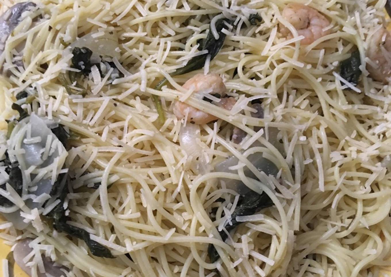 - Notes- the garlic is the heart of the dish., the more the better. You can take the shrimp out or can substituted it for Scallops. I know the ingredients looks like a lot especially the bag of spinach but that cooks down and fast, can also substitute that with kale. Can also add slices of tomato’s, just add the tomatoes slices on top of the spinach, it will also help hold down the spinach as it cooks down.