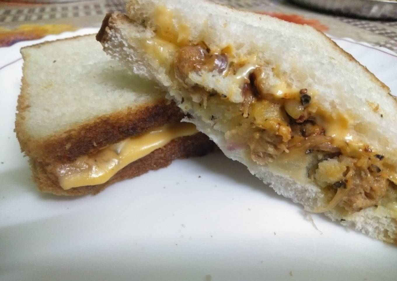- On top of the bread slice put the potato mixture and the dry fried soya bean. Then place the cheese slice on it on another bread put some mayo and oregano and place on the top of the other.