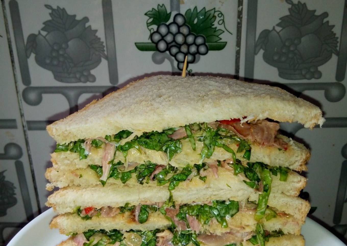 - Start puting one layer of bread and put the mixture on top, top with slice tomato and put another layer add the mixture again and top with another slice bread stick toothpick in the edges and cut as seing in the picture