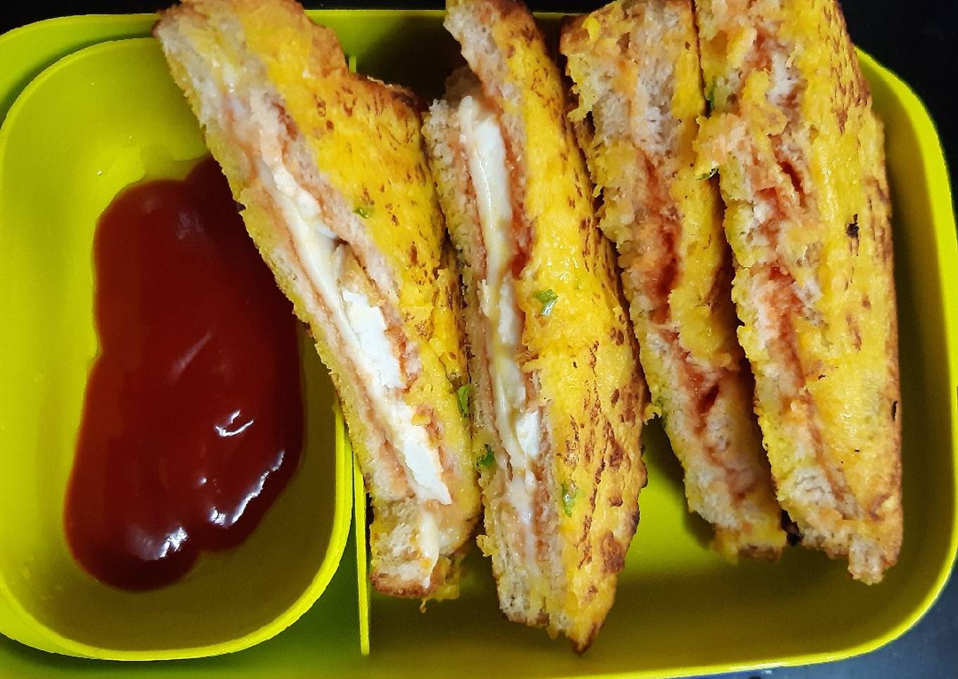 - Now apply ketchup on one side of bread and paneer pieces and cheese slice and apply ketchup and another bread slice and cover it and dip in slurry and deep fry it..