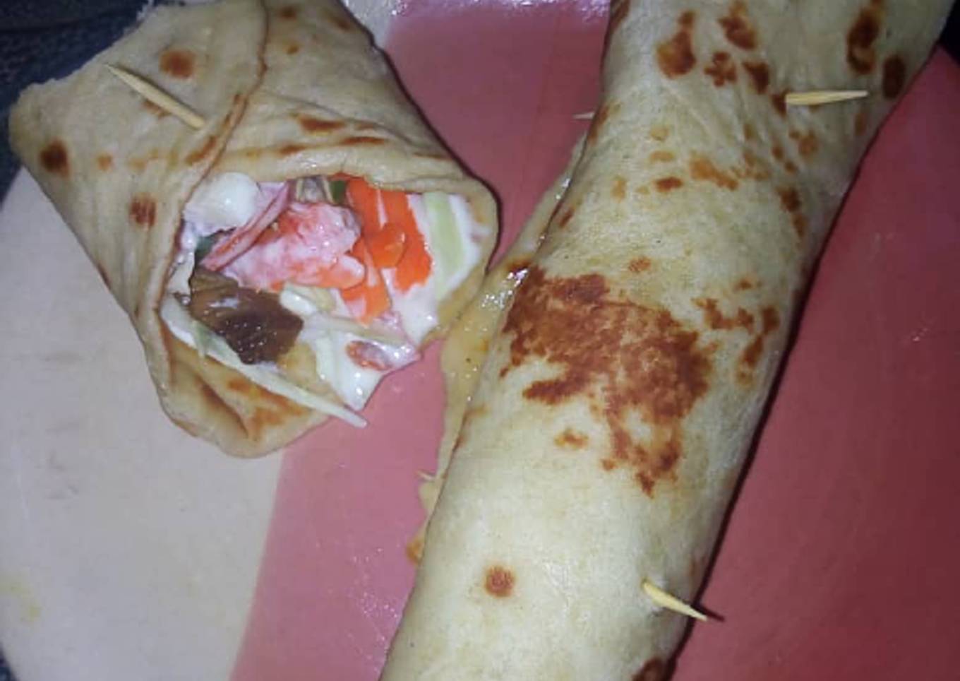 - Then fold the bread, stuck in the edge and roll to form a shawarma wrap yummy