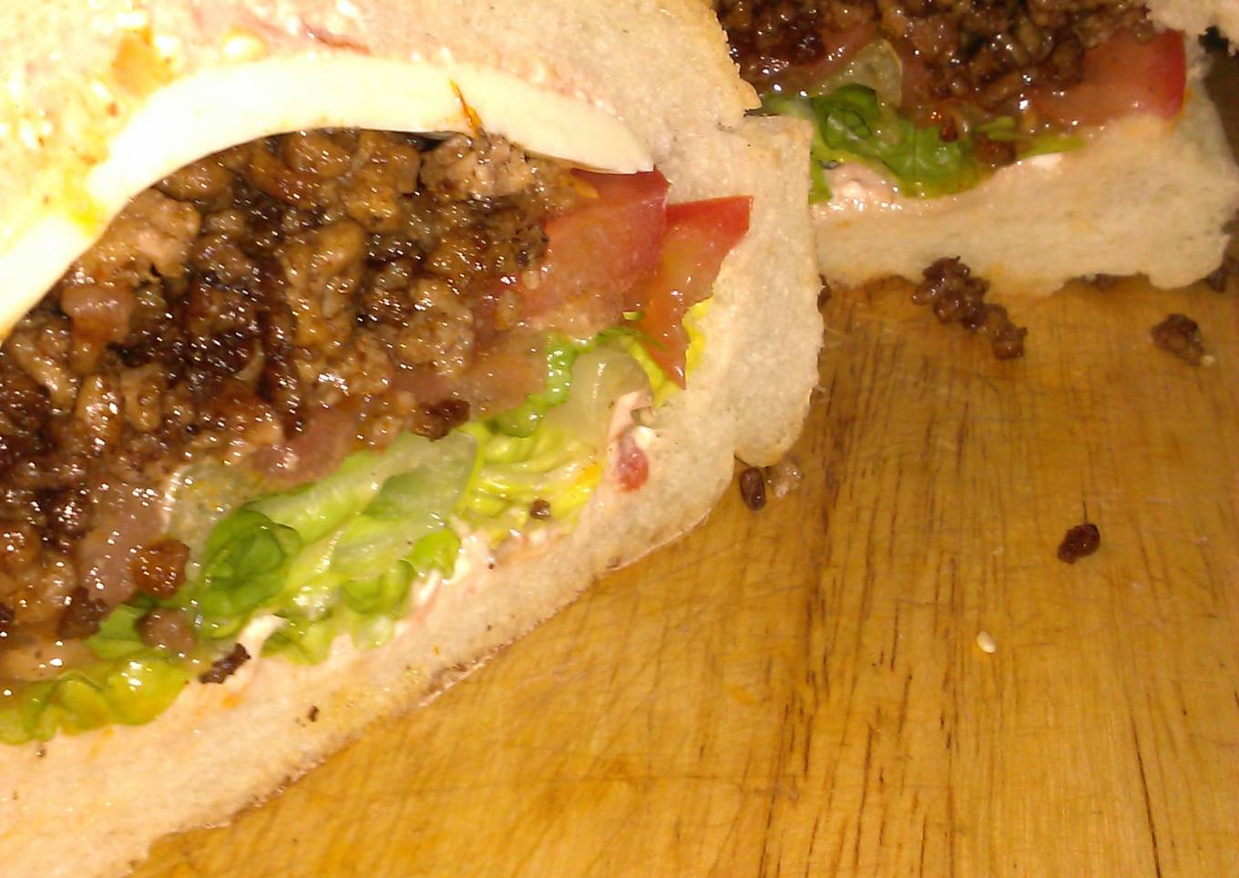 - Drain beef. Stir in taco seasoning. Layer lettuce & tomato in bottom of bread. Top with beef. Replace bread top.